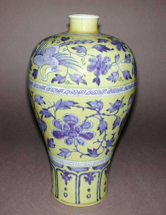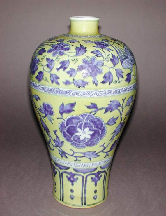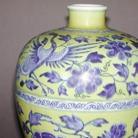 材质与色泽:以瓷土为胎体,质地细腻。瓶身施黄釉为地,色泽温润柔和;以青花料绘制纹饰,青花发色沉稳,呈现出深浅不一的蓝紫色调,与黄色釉底相互映衬,色彩对比鲜明,富有视觉冲击力。