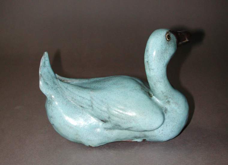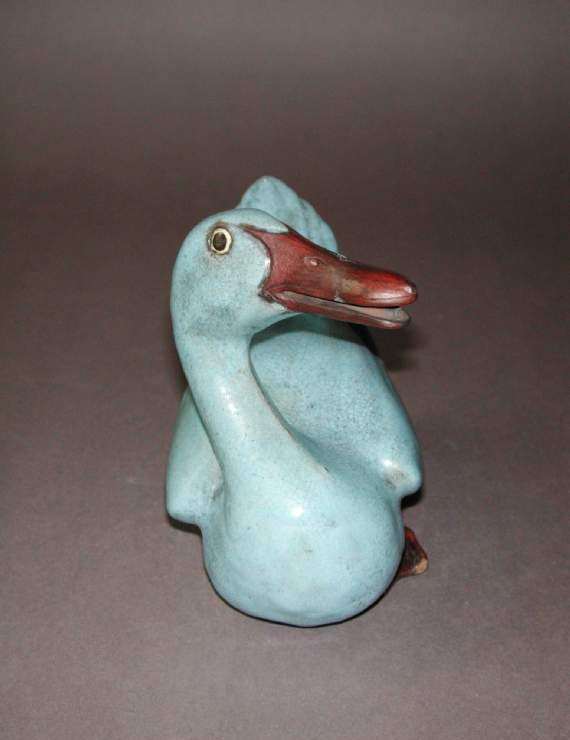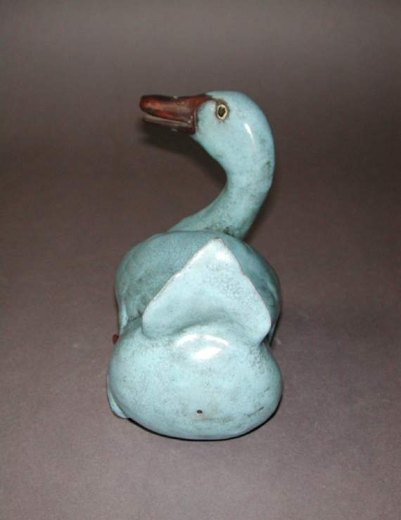 材质与色泽:以瓷土为胎体,质地细腻。通体施蓝釉,釉色呈现出淡雅的天蓝色,釉面有开片效果,增添了古朴之感;鸭喙和鸭蹼部分施褐红色釉,与蓝釉形成鲜明对比,使鸭子的形象更加鲜活。
