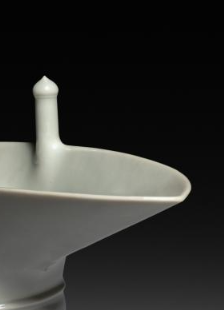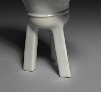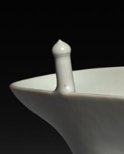本品规格为15 厘米。整体造型模仿古代青铜爵的样式,器身呈敞口状,口沿处设有两个立柱,造型简洁挺拔。杯身线条流畅,腹部微微收束,下承以三个修长的锥形足,使器物显得端庄稳重且富有韵律感。通体施白釉,釉色纯净莹润,白中泛着淡淡的青色,质感细腻,展现出明代白釉瓷器的典型特征。其既保留了传统爵杯的形制韵味,又通过莹润的白釉赋予了器物雅致清新的艺术风格,是明代仿古瓷器中颇具代表性的作品,体现了当时制瓷工艺对古代器物造型与审美意趣的传承与创新。