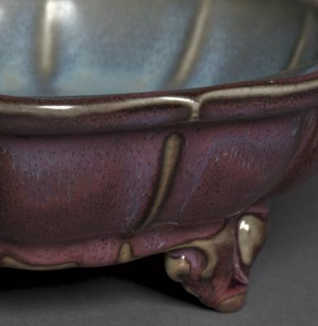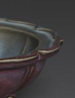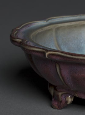 本品规格为直径23.5厘米。高度8厘米。器物整体呈菱花形,口沿为花瓣状,线条优美流畅。器身施有玫瑰紫釉,釉色浓艳瑰丽,其间还带有蓝灰色等窑变色彩,釉面光泽柔和,尽显钧窑 “入窑一色,出窑万彩” 的神奇窑变效果。底部以三只造型精巧的足支撑,足部设计别致,增添了器物的灵动与稳重感。整体造型端庄典雅,釉色绚丽多姿,工艺精湛,是明代钧窑瓷器中的精品。