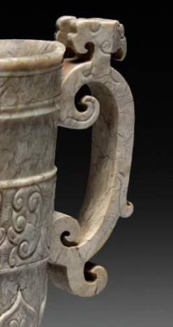 本品规格为11.5 厘米。器物整体造型为匜形,口沿一侧微微倾斜,形成流口,方便倾倒液体。器身装饰有精美的纹饰,中部位置有一圈连续的卷草纹,线条流畅优美,富有动感;下部则雕刻有如意云头纹,图案规整,增添了器物的层次感和装饰性。最为独特的是它的柄部,雕刻成龙首造型,龙首雕刻精细,龙须、龙角等细节栩栩如生,龙嘴微微张开,仿佛在咆哮,龙身蜷曲形成把手,方便握持。