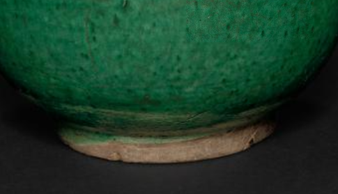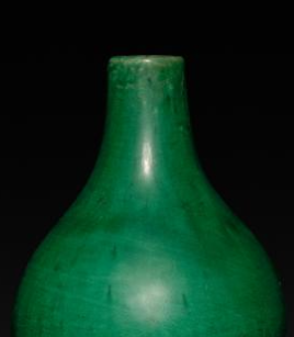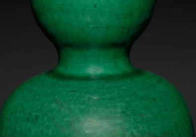 本品规格为20.2 厘米。瓶身呈葫芦造型,由上下两个球体组成,上部球体较小,下部球体较大,中间以束腰连接,线条流畅自然,比例协调,尽显圆润饱满、玲珑雅致之态。通体施绿釉,釉色浓郁鲜亮,如翡翠般温润,釉面带有细微的质感变化,更添古朴韵味。简洁的葫芦造型与明艳的绿釉相互映衬,既体现了明代瓷器对传统吉祥造型的运用,又展现出绿釉瓷器工艺的特色,是明代陶瓷艺术中颇具代表性的陈设器具。