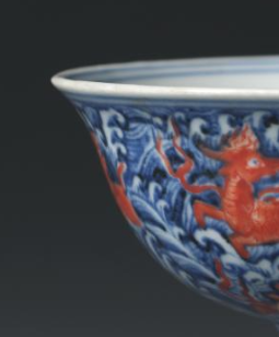 本品规格为9 x 9.9 厘米。整体造型为高足杯样式,杯身敞口,腹部较深,下承以修长的高足,造型优雅挺拔。杯身以青花描绘汹涌的海水纹,海水波涛翻卷,线条流畅自然,展现出灵动的韵律感。在青花海水纹的映衬下,以矾红彩绘制出瑞兽形象,瑞兽形态各异,或奔腾或嬉戏,色彩鲜艳夺目,与青花的蓝白形成鲜明对比,视觉效果强烈。