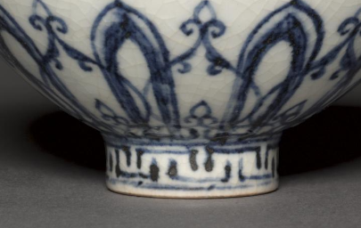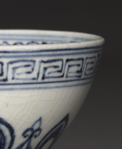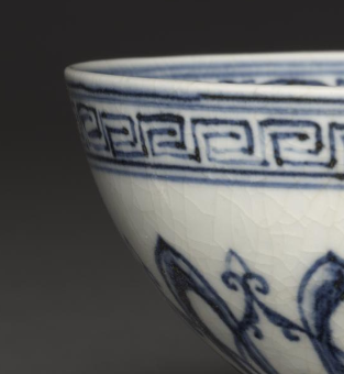 本品规格为直径10.2厘米,高度6厘米。碗体以白瓷为胎,通体施釉,釉面带有自然的开片,呈现出古朴的质感。碗口边缘饰有一圈青花回纹,线条规整,富有韵律感。碗身主体绘有青花莲瓣纹,莲瓣造型优美,花瓣线条流畅且富有变化,青花发色深沉典雅,部分区域因料质等因素呈现出浓淡不一的效果,更添层次感。碗底为圈足,足墙处也有简洁的青花装饰。