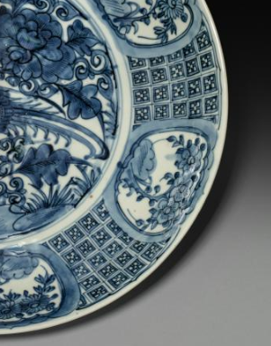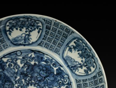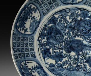本品规格为直径47.3厘米,高度9.7厘米。盘体呈圆形,造型规整。盘面以青花为饰,色彩浓淡相宜,层次丰富。盘心绘有一只姿态生动的雉鸡,羽毛纹理细腻,或振翅欲飞,或安然伫立,周围环绕着盛放的牡丹花朵,花瓣饱满,花叶舒展,尽显雍容华贵之态。盘的边缘分布着多个开光区域,内绘花卉、山水等纹样,开光之间以几何形纹饰相隔,整体构图繁而不乱,布局精巧。