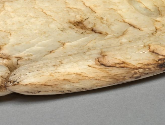 本品规格为7.7 厘米。整体造型近似长条形,雕刻有凤鸟造型。凤鸟身姿优美,线条流畅,虽没有过多繁复的雕琢,但凤鸟的形态神韵通过简洁的线条得以展现。凤鸟身上还雕刻有羽毛等细节,边缘处雕刻有卷云纹等装饰,增加了层次感与艺术美感 。器物上还带有穿孔,可能是为了便于与其他部件组合使用。