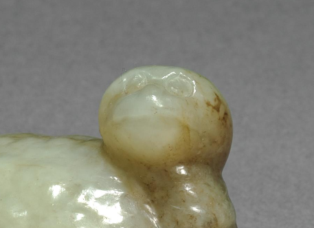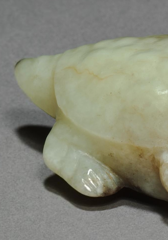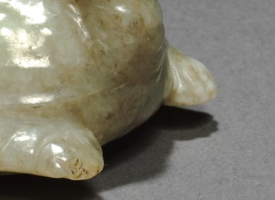 本品规格为6.1 厘米。整体呈现出乌龟的形态,龟身圆润饱满,头部微微抬起,神态生动自然,仿佛正悠然爬行。玉石色泽淡雅,带有自然的纹理与细微的沁色,更添古朴韵味。龟甲、四肢等细节处雕刻细致,线条流畅,将乌龟的形态与质感刻画得较为逼真,展现出明代玉雕工艺注重写实与神韵兼具的特点,是一件兼具艺术价值与历史价值的明代玉器精品。