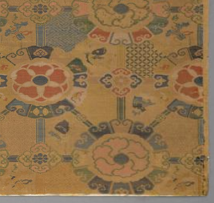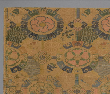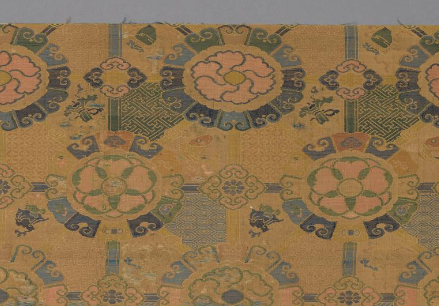本品规格为57.8 x 101.6 厘米。以丝织物为材质,整体呈现出温暖的黄褐色调,色泽古朴典雅。其上运用多种彩色丝线进行织锦,色彩丰富,有红、绿、蓝、粉等,不同颜色相互搭配,使图案更加绚丽多彩。锦缎表面布满了精美的花卉纹样,花卉造型多样,有盛开的花朵、花苞等形态,花朵周围还搭配有几何形状、卷草纹等辅助纹饰。这些图案排列规整,呈现出对称或重复的布局,富有节奏感与韵律感,展现出明代织锦工艺的精湛技艺与独特审美。