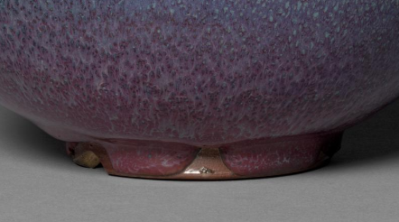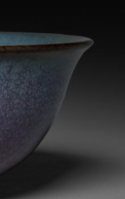 本品规格为直径17.8厘米,高度7.7厘米。整体造型为敞口、弧腹、圈足,器型规整大气。碗身以天蓝色釉为底,釉色温润似天空,质感莹润。在天蓝色的釉面上,自然晕染出大片的紫斑,紫斑色泽浓郁且分布富有自然意趣,与天蓝釉相互交融,形成了钧窑独特的窑变效果,宛如云霞漫布天际,变幻莫测,极具艺术感染力。