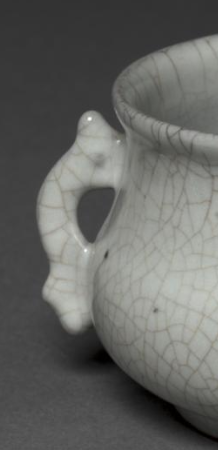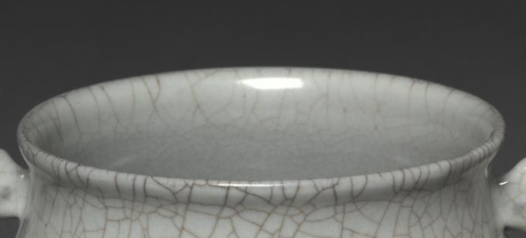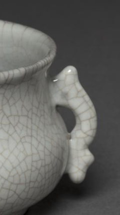 本品规格为7.3 x 15.6 厘米。整体造型为圆形,敞口,鼓腹,底部平稳。炉身两侧设有造型别致的双耳,增添了器物的灵动之感。通体施白釉,釉面布满自然开片,裂纹纵横交错,如冰裂般细腻,呈现出独特的艺术效果,这是南宋瓷器开片工艺的典型特征。白釉纯净素雅,与开片的纹理相互映衬,更显古朴雅致。此炉不仅具有实用的焚香功能,其精美的造型与独特的开片釉色,也体现了南宋瓷器高超的制瓷工艺与审美追求,是研究南宋陶瓷艺术的重要实物资料。
