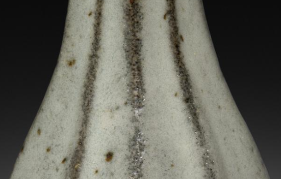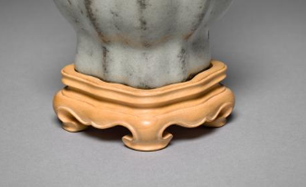 本品规格为直径6厘米,高度11.7厘米。造型优美雅致。瓶身呈瓜棱状,线条流畅自然,从瓶口至瓶底,棱线清晰规整,赋予器物独特的韵律感。其釉色为温润的青灰色,釉面质感细腻,带有官窑瓷器典型的开片特征,虽不明显却为器物增添了古朴韵味。瓶口呈花口状,微微外撇,与修长的瓶身相呼应,整体比例协调。瓶身底部搭配有一个造型精巧的底座,底座色泽柔和,与青釉瓶身形成色彩对比,更凸显出瓜棱瓶的端庄与精美,充分展现了南宋官窑高超的制瓷工艺与独特的艺术审美。