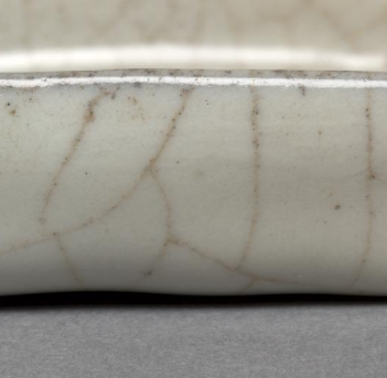 本品规格为1.2 x 6.4 厘米。整体造型为四方形,边角呈倭角状,线条柔和。其釉色温润,呈现出淡雅的色泽,釉面布满了细密的开片纹,开片纹自然且富有层次感,是南宋官窑瓷器的典型特征,给器物增添了古朴雅致的韵味。