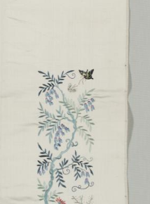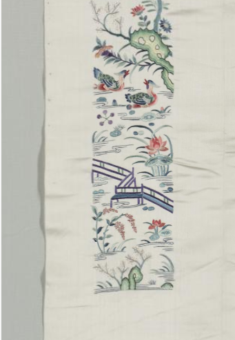 本品规格为111.8 x 38.1 厘米。整体以白色为底,色调素雅洁净。其上绣有精美的花鸟纹饰,左右两侧的纹样对称分布,图案包含花草、禽鸟等元素,还有小桥等景致,构图细腻,绣工精巧,色彩搭配和谐,将花鸟的灵动与自然景致的清幽展现出来。挽袖的边缘处有粉色等色彩的装饰条带,增添了层次感。它不仅是清代服饰装饰部件,更是体现当时刺绣工艺水平与审美意趣的艺术品,反映出清代在服饰装饰方面对细腻纹饰与雅致色彩的追求。