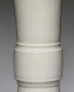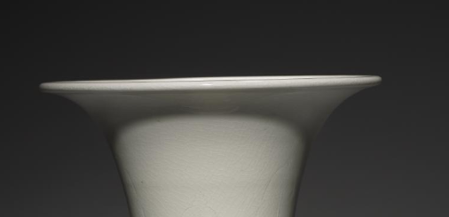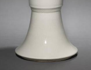 本品规格为42.9 厘米。花觚整体造型修长挺拔,线条流畅优美。它敞口,颈部较细,中部有凸起的弦纹装饰,腹部微鼓,底部为外撇的圈足,各部分比例协调,尽显端庄雅致之态。通体施白釉,釉色纯净洁白,釉面匀净润泽,还带有细微的开片纹,增添了古朴的韵味。
