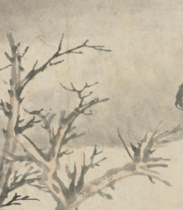 本品规格为29.9 x 39.4 厘米。画面以淡墨为主色调,营造出清冷孤寂的氛围。左侧几株枯树虬枝交错,枝干光秃,尽显萧瑟之态。右侧,一位身着素衣的士人立于山石旁,似在凝视眼前的山水景致。背景中,远山朦胧,云雾弥漫,与近景的枯树、人物相互映衬,更添幽远空灵之感。画面左上角还有题诗,字体古朴,与画作的意境相得益彰,整体展现出文人画特有的清幽淡远、超然物外的艺术风格,传递出一种孤寂却又悠然的心境。