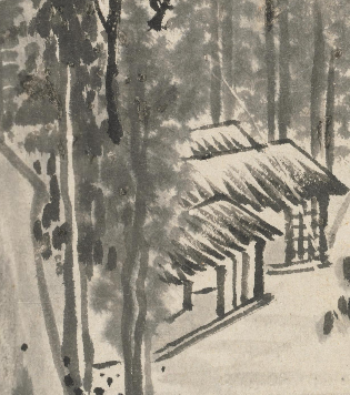 本品规格为29.9 x 39.4 厘米。画面以水墨绘就,展现出一处静谧的山林居所之景。画面中,林木郁郁葱葱,各类树木形态各异,或挺拔高耸,或虬曲多姿,营造出浓密的山林氛围。林间有屋舍掩映,屋顶覆以茅草,古朴自然,似是隐士的居所。还有小桥横跨于溪流之上,一位士人模样的人物立于桥上,似在赏景或行走,为画面增添了生活气息与人文意趣。远处山峦连绵,在淡墨的晕染下,显得悠远而朦胧。整体画面布局疏密有致,笔墨简洁淡雅,营造出清幽静谧、远离尘嚣的林泉幽居意境,尽显文人山水的雅致与超然。