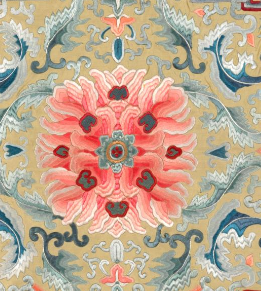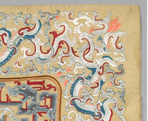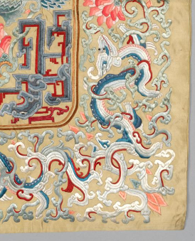 本品规格为75 x 105.4 厘米。整体呈方形,以柔和的浅色调为底,刺绣工艺极为精湛。方巾上装饰有丰富多样的纹样,中心是一朵硕大且色彩艳丽的花卉,花瓣层次分明,色泽饱满,尽显娇艳之态。周围环绕着精致的龙纹,龙纹线条流畅,姿态灵动,仿佛具有生命力。此外,还有回纹等传统吉祥纹样,与花卉、龙纹相互搭配,布局规整且富有层次感。色彩运用上,融合了粉色、蓝色、红色等多种色调,相互映衬,既显得华贵典雅,又充满了生机与活力,充分展现了清代刺绣工艺的高超水准和独特的艺术审美,是清代刺绣艺术中的精品,承载着丰富的文化内涵与艺术价值。