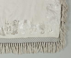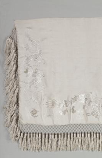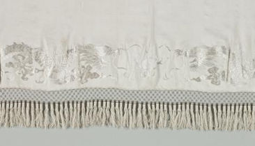 本品规格为213.3 x 53.4 厘米。以白色织物为基底,整体色调素雅。运用丝线进行刺绣,虽色彩不算丰富,但绣线与底色形成一定反差,凸显出图案轮廓。边缘处有浅米色的流苏装饰,增添了柔和、飘逸的质感。在桌旗表面,绣有花鸟等图案。花卉形态优美,花瓣、枝叶的线条细腻流畅,虽颜色较淡但仍能看出其精致的造型;鸟类姿态灵动,或展翅欲飞,或栖息枝头,栩栩如生。刺绣针法细腻,图案分布疏密有致,虽没有浓墨重彩,但尽显清新雅致之风 。在靠近流苏处,可能还绣有一些几何纹等辅助图案,增加了整体的层次感。