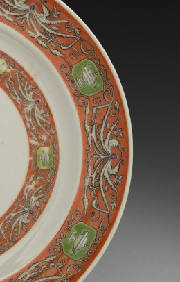 本品规格为19.7 厘米。瓷盘整体造型规整,胎质细腻。盘面以矾红为主色调,搭配描金工艺,色彩对比鲜明,富丽堂皇。盘心绘有花鸟图案,鸟儿姿态灵动,花草栩栩如生,展现出细腻的绘画功底。盘身分布着开光区域,开光内装饰有精美的纹饰,与盘心的花鸟图案相互映衬,整体构图精巧,层次丰富。矾红的热烈与描金的华贵相得益彰,既体现了清代瓷器工艺的精湛,又展现出独特的艺术审美,是清代瓷器中兼具实用与艺术价值的典型器物,反映了当时制瓷技艺的高超水平与装饰艺术的繁荣。