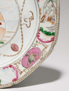 本品规格为23.7 厘米。盘口呈花口状,造型别致。盘身以粉彩工艺精心绘制图案,色彩丰富且搭配和谐。盘心描绘有人物形象,人物姿态优雅,身旁还有纹章元素,彰显独特的文化内涵。盘身分布着多个开光区域,开光内绘有花卉、动物等纹饰,花卉娇艳,动物生动,细节刻画细腻。盘边还装饰有金色的线条与图案,与粉彩纹饰相互映衬,更显华贵精致。