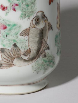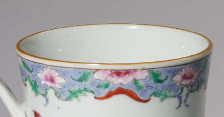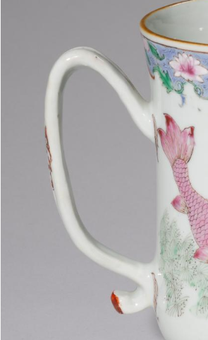 本品规格为口径11.5厘米,高度15.9厘米。以洁白的瓷质为胎体,整体造型为带把手的杯形,线条流畅自然。杯口边缘饰有一圈金色,增添了华贵之感。杯身以粉彩工艺绘制图案,上部有蓝底搭配粉色花朵及绿色枝叶的纹饰带,色彩搭配和谐,图案精致细腻。主体部分描绘了鱼藻场景,有色彩鲜艳的粉色鲤鱼和形态灵动的灰色鲤鱼,周围辅以绿色水藻、粉色小花等,将水中鱼儿悠然游动的画面生动呈现,色彩丰富明快,笔触细腻,尽显清代粉彩瓷器的工艺精湛与艺术美感,既具实用价值,又有极高的艺术与收藏价值。