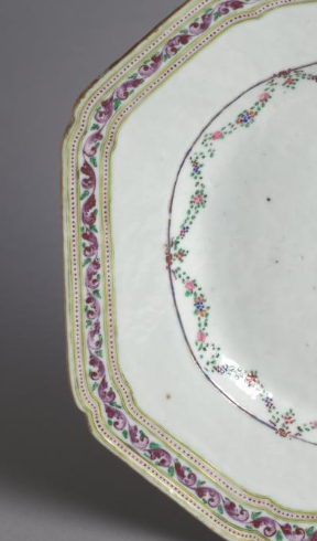 本品规格为21.4厘米。整体呈椭圆形,造型规整。盘身以白色为底,装饰极为精美。盘心绘有纹章图案,纹章主体色彩鲜明,搭配精致的边框,颇具异域风格,体现出当时中西文化交流的特点。盘的边缘环绕着多层装饰纹样,有色彩艳丽的花卉、卷草等图案,采用广彩工艺绘制,色彩丰富,包括紫色、粉色、绿色等,相互映衬,显得华贵典雅。