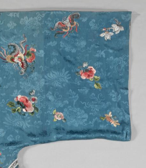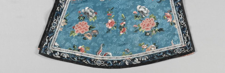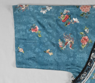 本品规格为111 x 167.6 厘米。整体以蓝色为底色,色彩沉稳且富有典雅韵味。袄身布满精美的花卉刺绣纹样,花朵色彩丰富,有粉色、红色等,搭配绿叶,鲜活灵动,仿佛将春日花园的生机凝于衣上。斜襟处装饰有精致的黑色镶边,镶边之上又有白色的花纹刺绣,与蓝色衣身和多彩花卉相互映衬,层次分明,更显华贵。衣袖宽大,符合清代女装的形制特点,穿着时想必能展现出温婉端庄的气质。
