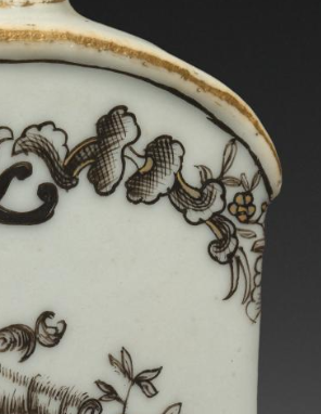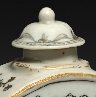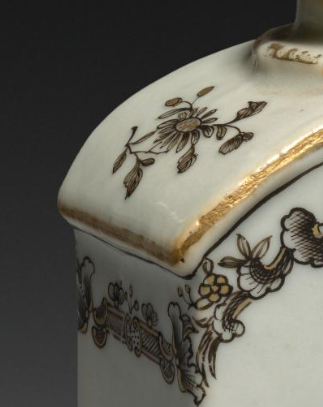 本品规格为11.5 x 6.6 厘米,直径4.7厘米。整体呈方形,造型规整,线条简洁利落。罐身以洁白的瓷胎为底,装饰工艺精美,运用了墨彩与描金技法。墨彩绘制的花卉、枝叶等纹饰细腻生动,搭配描金的线条与图案,增添了华贵之感,尤其是正面带有徽章样式的纹饰,设计独特,细节刻画精致,彰显出浓郁的艺术气息。罐盖为弧形,顶部有圆润的钮,与罐身相呼应,整体既体现了清代瓷器制作的精湛工艺,又融合了带有外来风格的徽章元素,具有较高的艺术与历史价值,是清代瓷器中兼具实用与装饰性的精品。