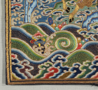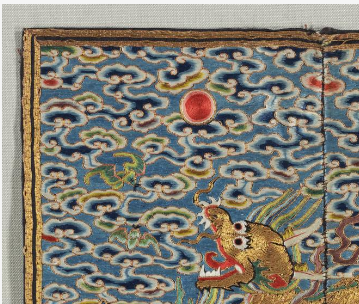 本品规格为25.4 x 25.1 厘米。补子中间的主体图案是一只麒麟,麒麟造型威武,周身以金线绣成,线条流畅,展现出其矫健的身姿。麒麟头部双目圆睁,张开大口,露出锋利牙齿,鬃毛飞扬,富有动感;身上装饰有彩色纹路,更显华丽。 四周环绕着形态各异的云纹,绣工细腻,云纹色彩多样;下方绣有海水江崖纹,层层波浪形态逼真,江崖处还点缀有一些象征吉祥的小图案,如珊瑚、火珠等;上方绣有红日, 整个补子构图饱满,层次分明,充满了威严庄重之感。