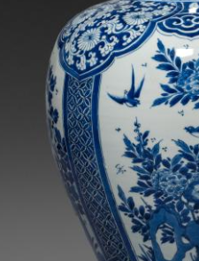 本品规格为46.2 厘米。盖罐整体造型端庄典雅,由罐身和盖子两部分组成。罐身以洁白的瓷胎为底,以青花为饰,色彩浓淡相宜,层次丰富。主体纹饰为花卉图案,花朵盛放,枝叶舒展,其间还有飞鸟点缀,灵动自然,尽显生机。罐身还辅以其他辅助纹饰,如边缘的几何纹等,与主体花卉纹相互映衬,布局精巧。盖子顶部有蓝色的钮,盖面同样装饰有青花花卉等纹饰,与罐身风格统一。