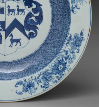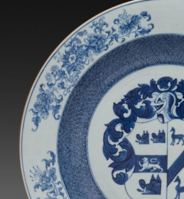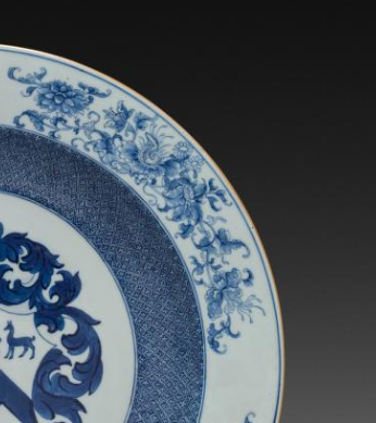 本品规格为直径38.3厘米,高度5.5厘米。整体呈圆形,器型规整大气。盘身以洁白的瓷胎为底,采用青花工艺进行装饰,青花色泽浓淡相宜,层次丰富。盘心绘有精致的徽章纹饰,徽章造型复杂且富有异域特色,周围环绕着华丽的卷草纹等装饰图案;盘沿部分则饰有细腻的花卉纹样,花朵、枝叶等描绘得栩栩如生,尽显清雅秀美的艺术风格。