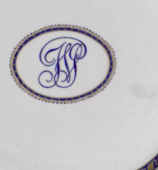 本品规格为24.9 厘米。瓷盘整体造型规整,胎质细腻。盘面以白色为底,装饰工艺精美。盘心绘有蓝色的字母纹图案,字母造型优雅流畅,周围环绕着精致的边框装饰。盘身边缘采用了描金工艺,金色与蓝色相互映衬,搭配上细密的纹饰,使瓷盘显得华贵典雅。青花的淡雅与描金的富丽相得益彰,展现出清代瓷器制作工艺的精湛,同时也体现了中西文化交流融合下的艺术特色,具有较高的艺术与历史价值。