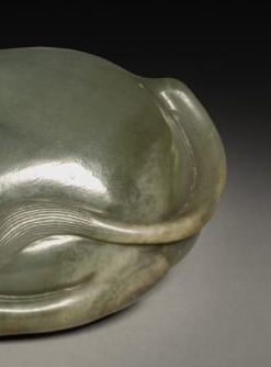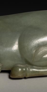 本品规格为21厘米。整体以青玉为材质,玉色温润,质地细腻。玉雕呈现出一头牛卧躺的姿态,造型写实且生动。牛的头部雕刻细致,双角弯曲自然,眼部、鼻部等细节刻画入微,神态安详。躯体部分线条流畅,肌肉纹理通过简洁的雕琢手法得以体现,尾巴自然蜷曲,四肢收于腹下,将牛慵懒休憩的模样展现得淋漓尽致。玉器表面光泽柔和,带有岁月沉淀的古朴质感,体现了清代玉雕工艺在动物题材创作上的精湛技艺,既具实用的陈设赏玩价值,又蕴含着对牛所象征的勤劳、稳重等美好品质的推崇,是清代玉雕艺术中颇具代表性的作品。