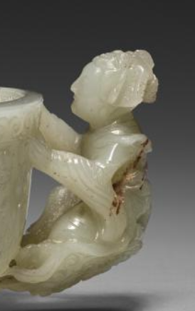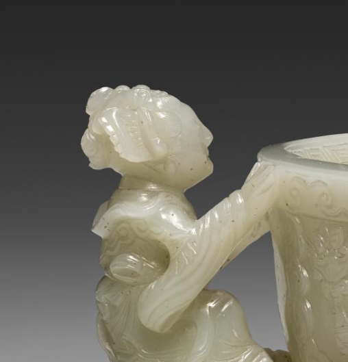 清代,玉器制作工艺高度发达,玉杯是贵族阶层喜爱的饮酒器具之一。这件双仕女形耳玉杯, 其造型适合手持,在一些贵族家庭的宴饮场合,主人和宾客可能会用它来盛放美酒, 彰显身份地位和高雅品味 。