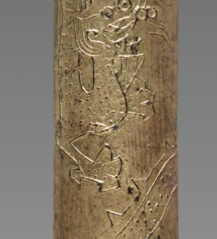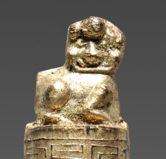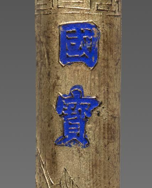 本品规格为8.6 厘米。主体材质为铜,表面进行了鎏金处理,呈现出金黄色泽。因岁月侵蚀,部分鎏金有磨损痕迹,露出铜的底色,形成斑驳的质感。此外,柱身刻有文字的部分填以蓝色颜料,色彩对比鲜明。器物整体为圆柱状,顶部铸造有一只狮子造型的钮,狮子憨态可掬,蹲坐于柱顶,细节刻画较为生动,如毛发、面部表情等都清晰可见。柱身自上而下刻有 “国宝” 二字,字体规整。在文字下方,还刻绘有图案,可能是人物、山水等题材,线条流畅,虽然画面因岁月有些模糊,但仍能看出刻绘工艺的精湛。柱身上下两端可能还装饰有一些简单的几何纹等边框纹饰,增加了器物的层次感和装饰性。