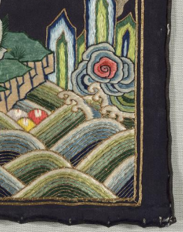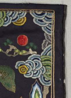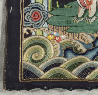 本品规格为27.3 x 26 厘米。主体图案是一只獬豸,獬豸身形矫健,毛发根根分明,双目圆睁,神态威严。獬豸身上绣有红色纹路,更显其威风凛凛。四周绣有云纹、山石、海水江崖等图案,云纹形态各异,有如意云、卷云等;山石用绿色绣线表现,线条流畅;海水江崖纹以蓝、绿等色丝线绣出层层波浪,底部还有象征吉祥的八宝等小图案。整个补子构图饱满,布局严谨 。