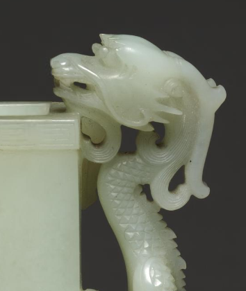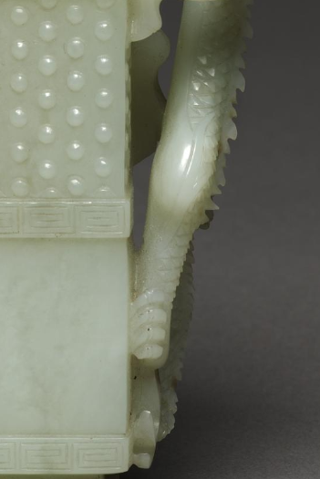 本品规格为14 厘米。采用玉质材料雕琢而成,整体呈现出温润的淡绿色,玉质细腻,光泽柔和,尽显玉石的温润质感,给人一种清新雅致的感觉。器型为方形尊,尊体规整,线条简洁流畅。尊身中部雕刻有凸起的谷纹,排列整齐,富有韵律感。一侧有一条雕刻精美的龙,龙身蜿蜒曲折,龙首高高抬起,龙爪遒劲有力,雕刻工艺精湛,将龙的威严与灵动展现得淋漓尽致,龙与方尊结合紧密,浑然一体。