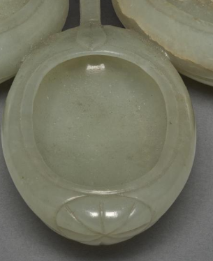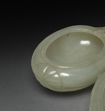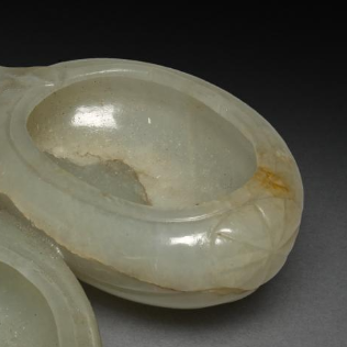 本品规格为8 厘米。造型独具匠心,雕琢成三个相互连接的桃形。每个桃形部分都是一个独立的浅碗状,用于盛水。桃子边缘圆润,表面雕刻有简洁的花瓣纹路,凸显桃子的形态。三个桃形通过中间类似桃枝的结构相连,整体造型生动形象,富有自然的美感 ,体现了清代玉雕师对生活中美好事物的观察与艺术再现能力。