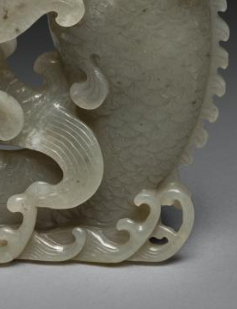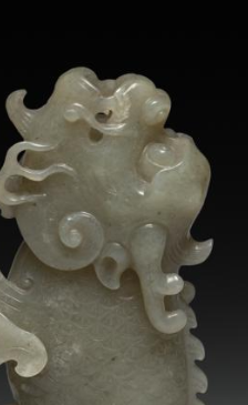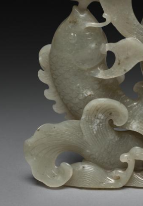 本品规格为12.7 厘米。雕琢成鱼龙变化的形态,一条鱼与龙的形象相互交融、过渡。鱼的身形灵动,鳞片等细节雕刻细致;龙的头部、龙须等特征鲜明,龙身与鱼身衔接自然,周围还雕刻有云纹、水波纹等,线条流畅优美,将鱼龙变化的奇幻场景生动地展现出来,雕刻工艺精湛,富有艺术感染力。