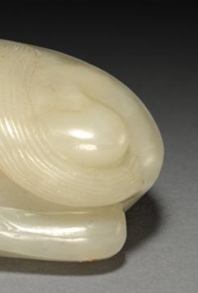 本品规格为3.5 厘米。整体造型为一匹卧姿的马。马的身体蜷曲,姿态悠闲温顺。头部微微抬起并转向一侧,双耳竖立,眼睛微闭似在休憩, 口鼻的线条刻画流畅自然,将马安静祥和的神态表现得栩栩如生 。马的鬃毛雕刻细致,富有层次感;四肢屈于腹下,肌肉线条圆润饱满,展现出力量感的同时又不失柔和 。整体造型写实,比例协调,工艺精湛,体现了清代高超的玉雕技艺。