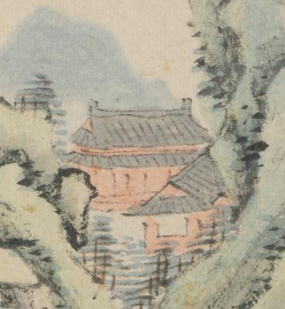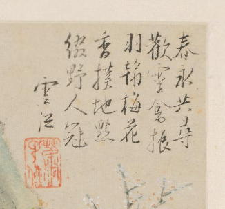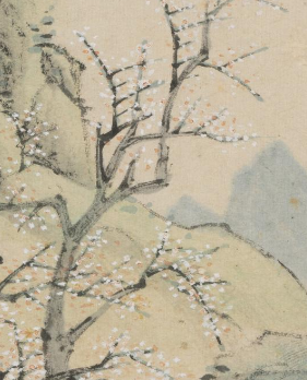 本品规格为21 x 15.8 厘米。远景处,山峦以清新的青绿等色彩绘就,形态起伏,山间隐约可见一座红墙屋舍,增添了人文气息。中景里,一株开花的树木(似为梅树)枝干舒展,花朵点缀其间,尽显春日生机。树下有几位士人相聚,或坐或谈,神态悠然,呈现出雅集之态。近景处,溪水潺潺流淌,还有仙鹤立于溪畔,为画面增添了灵动与清幽之感。画面上方的书法题字,与设色山水相互映衬,整体传递出春日山间文人雅士雅集的闲适、雅致意境,展现出萧云从设色山水创作中对山水与人文场景融合的精妙把握。