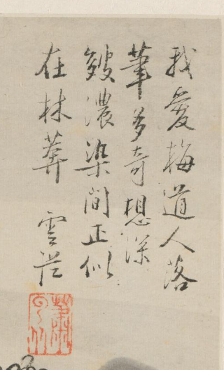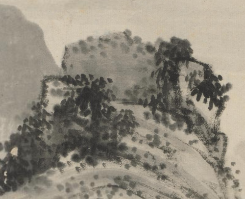 本品规格为21 x 15.8 厘米。以水墨为主要表现形式,画面布局简洁而富有意境。远景处,山峦连绵,以淡墨晕染,营造出悠远的空间感。中景里,树木枝叶繁茂,以浓淡相间的墨色细致描绘,展现出树木的生机与姿态。近景处,一座屋舍静静坐落于林麓之间,屋舍样式质朴,周围环绕着树木与山石,显得清幽静谧。画面右侧的书法题字,与水墨山水相互映衬,整体传递出林麓之下幽居之所的宁静、恬淡意境,体现出萧云从在水墨山水创作中对自然幽境与人文居所融合的精妙把握。