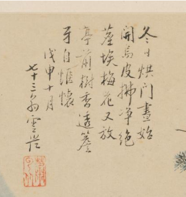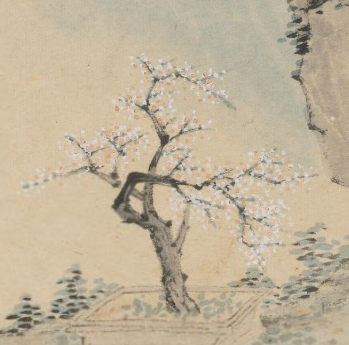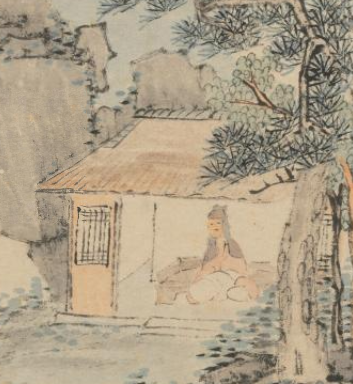 本品规格为21 x 15.8 厘米。画面布局雅致。远处山峦以淡蓝、浅灰等柔和色彩晕染,朦胧悠远,营造出静谧的山水氛围。近处,一间屋舍坐落在山石旁,屋中似有人物,增添了生活气息与人文韵味。屋旁有松树,枝干遒劲,松针细密,尽显苍劲之态;还有一株梅花树,花朵绽放,在山水间点缀出一抹灵动的亮色,与山舍相互映衬。画面上方配有书法题字,字迹流畅自然,与设色山水相得益彰,整体传递出清幽雅致、充满诗意的山水意境,展现出萧云从在设色山水创作上的精妙技艺与独特审美。