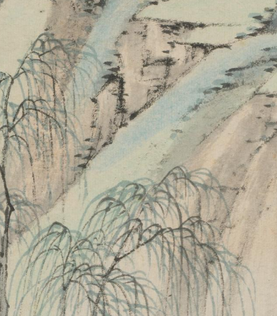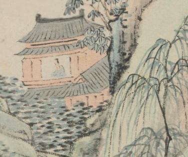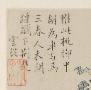 本品规格为21 x 15.8 厘米。远景处,山峦以淡雅的色彩晕染,层次分明,山间隐约可见一座屋舍,增添了人文氛围。中景里,桃树花开粉嫩,柳树枝条垂落,二者相互映衬,尽显春日生机。近景处,溪流潺潺,一座小桥横跨其上,还有两人骑马行于山道,呈现出行旅之态。画面左侧的书法题字,与设色山水相得益彰,整体传递出桃柳掩映下溪山行旅的清新、雅致意境,展现出萧云从设色山水创作中对春日山水与行旅场景融合的精妙把握。
