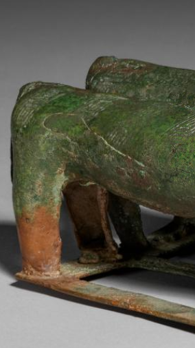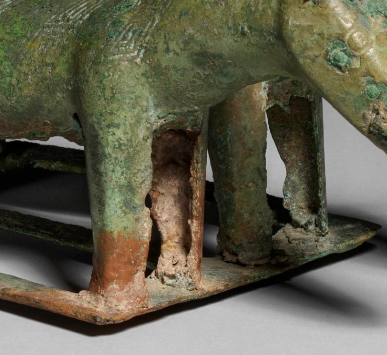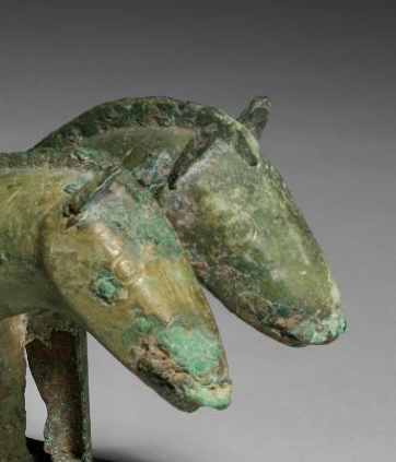 本品规格为11.4 厘米。以青铜铸造而成,整体呈现出两匹马并立的造型。器物表面因岁月侵蚀,覆盖着斑驳的铜绿锈迹,部分区域还显露出青铜原本的色泽,古朴沧桑之感尽显。两匹马姿态生动,马的身形、头部等细节虽历经时光仍有迹可循,它们立于方形底座之上,底座与马身相连,使整个器物结构较为稳定。此器展现出商代青铜铸造工艺在动物造型塑造上的特点,对于研究商代的畜牧业、青铜艺术以及当时的文化内涵等方面,具有一定的价值。