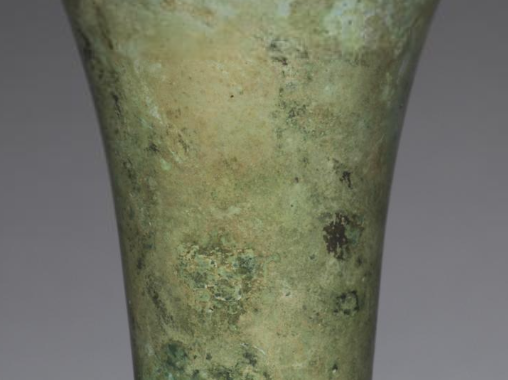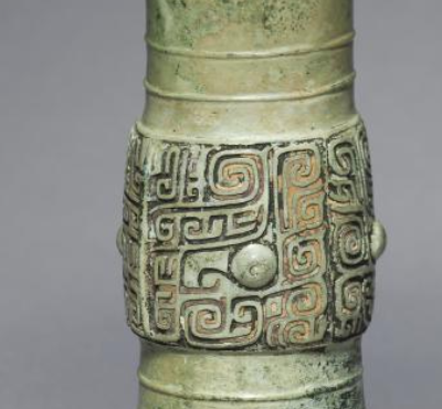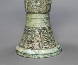 本品规格为直径14.5厘米,高度26.9厘米。整体呈喇叭口、细腰、高圈足的形态。口部大而外撇,如喇叭般展开,线条流畅;腰部纤细,将上下部分自然衔接;圈足较高且外撇,稳固地支撑起整个器身,造型修长优美,比例协调,尽显庄重典雅之态。器身装饰有兽面纹(饕餮纹)等纹饰。兽面纹以对称的方式分布,线条规整且富有变化,刻画精细,展现出神秘威严的气质。这些纹饰不仅具有装饰作用,更蕴含着商代人对神灵、权力的崇拜与敬畏,是当时宗教信仰和等级制度的视觉体现。