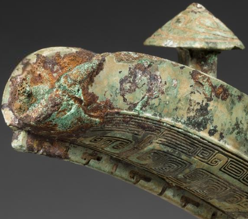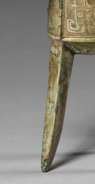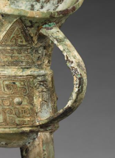 本品规格为20.3 x 19.7 厘米。它有着典型的青铜爵结构,口部前端是弯曲的流,方便倾倒酒水,后端则是上翘的尾,与流相互呼应,让整体看起来更为平衡灵动。口沿之上立着两根菌状柱,柱顶呈伞状,精致小巧。腹部一侧设有弯曲自然的鋬(把手),便于持握。底部有三只修长且带弧度的尖足,稳稳支撑起器身,既保证了稳定性,又显轻盈挺拔。