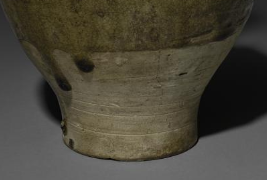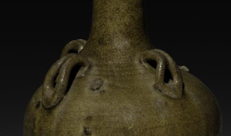 本品规格为21.9厘米。瓶身整体造型修长,口部呈盘状,瓶颈细长,肩部圆润,腹部饱满,底部收束。肩部对称设置有四个系(用于系绳等),方便搬运或悬挂。器物通体施青釉,釉色呈现出古朴的青黄色调,部分区域釉面有自然的斑点或流淌痕迹,增添了岁月的质感。胎体部分可见,质地较为坚实。