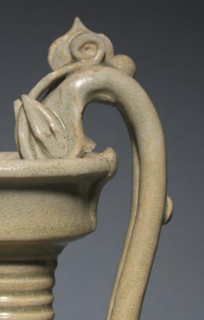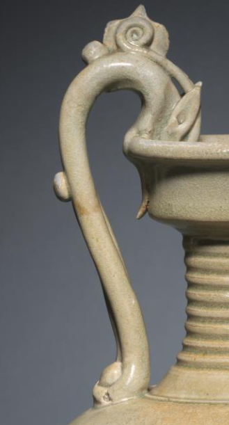 本品规格为直径20.3厘米,高度41.6厘米。瓶为盘口,口沿外撇,颈部修长,饰有弦纹,增添了层次感。腹部浑圆饱满,线条流畅自然,底部逐渐收束,使整个瓶身比例协调。尤为引人注目的是,瓶身两侧设置有双龙形柄,龙首向上,探向盘口,龙身弯曲呈柄状,与瓶身相连,龙的造型灵动矫健,细节刻画精致,既起到了实用的执握作用,又极具艺术装饰性,彰显出唐代工匠高超的造型技艺。