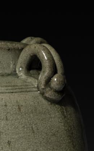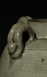 本品规格为25.5 厘米。整体造型圆润饱满,器身施有青釉,釉色淡雅,表面带有自然的开片纹理,增添了古朴的质感。罐的颈部两侧对称设置有四个系,系的造型为弯曲的绳状,线条流畅,既起到实用的系挂作用,又为器物增添了装饰性,使整体造型更显灵动。